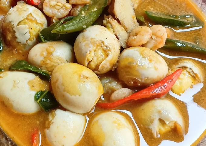 Kacau lagi dan masukkan kubis bunga. Masukkan telur puyuh rebus yang sudah dikupas secara perlahan ke dalam panci. Tumis bumbu halus hingga harum masukkan salam serai dan lengkuas.